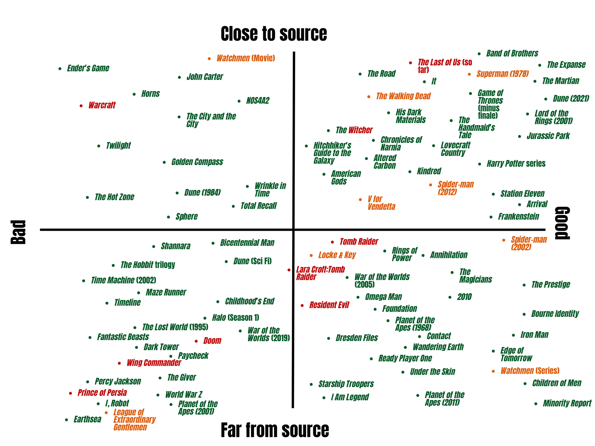 On a whim, I took a look through my closet of DVDs, came up with a list of adaptations, and began plotting them on a chart to see where how well they fared as a good movie.