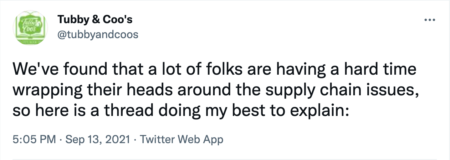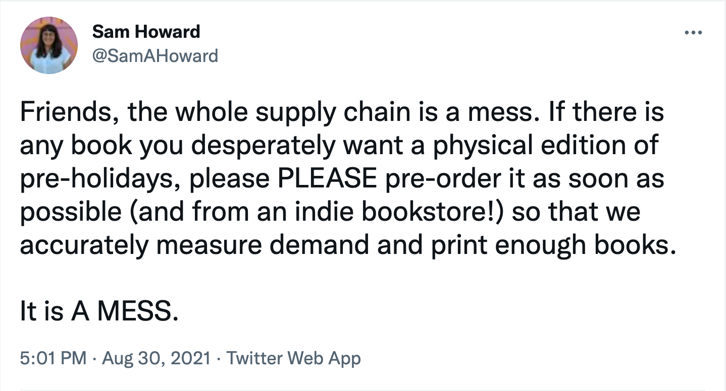 If you plan to buy books this holiday season, it's looking as though you're going to want to buy them early. In the last week or so, I've begun to see a couple of viral tweets pop up from booksellers and publishers, noting that they're anticipating some significant issues in getting books to customers.
