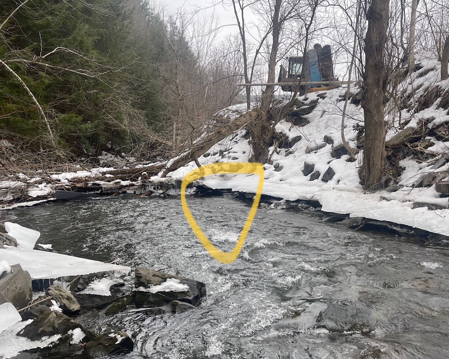 I didn't wait: I sprinted for the house, grabbed a large blue shopping bag, and pulled the car around to the other side, jumped out, and began searching. There are a bunch of places a chicken could hide: under a bunch of things, in barrels, and we only had a general idea of where the sound was coming from. Megan was on the other bank, and pointed out the general area for me to search. I couldn't find anything, and was about to turn back when I slipped down the bank. It's steep and icy, and I slid almost all the way to the edge, where a lip of ice jutted out over the water. On a whim, realized that there's some empty pockets under the ice, and the water had gone down from the prior night. I jumped in, and leaned down to check the cavities.