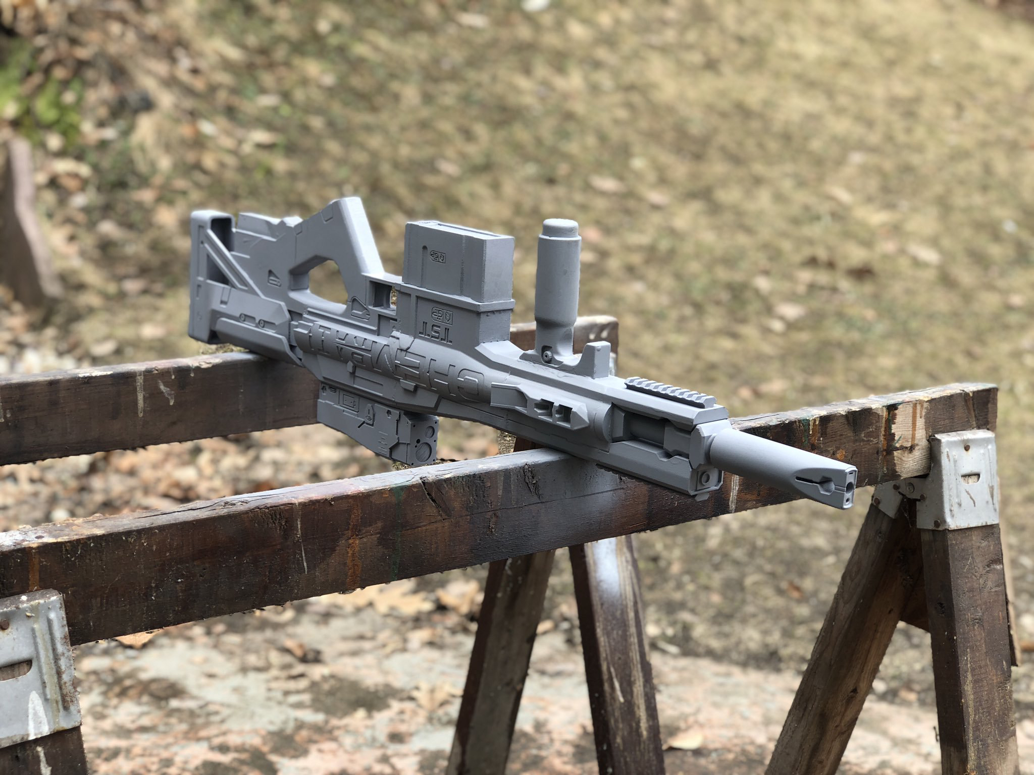 I have a handful of other things that I’ve been working on. I’m working on a ChemRail rifle from the movie Elysium, which just got its first coat of black paint. That’ll need another coat, some detail work, like coloring in the lettering, and painting the magazine, and a couple of other things here and there. This one doesn’t go with a costume, but it’ll make a nice display piece when it’s finished. I’ve also got some pieces of a Han Solo blaster that I’ve started printing out, but my printed is out of commission right now, and also a little too small for what I need. Might need to outsource that, but it’s not exactly a huge priority.
