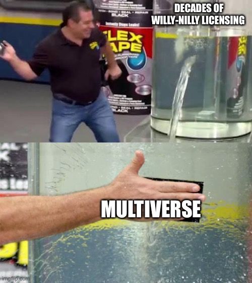 But with rare exceptions like Everything Everywhere All At Once (an excellent film that you should check out) the multiverse trope feels like a band-aid for decades of random licensing deals, an unsatisfying fix to try and bring everything together into a unified world that makes all of these inconsistencies congruent with one another.