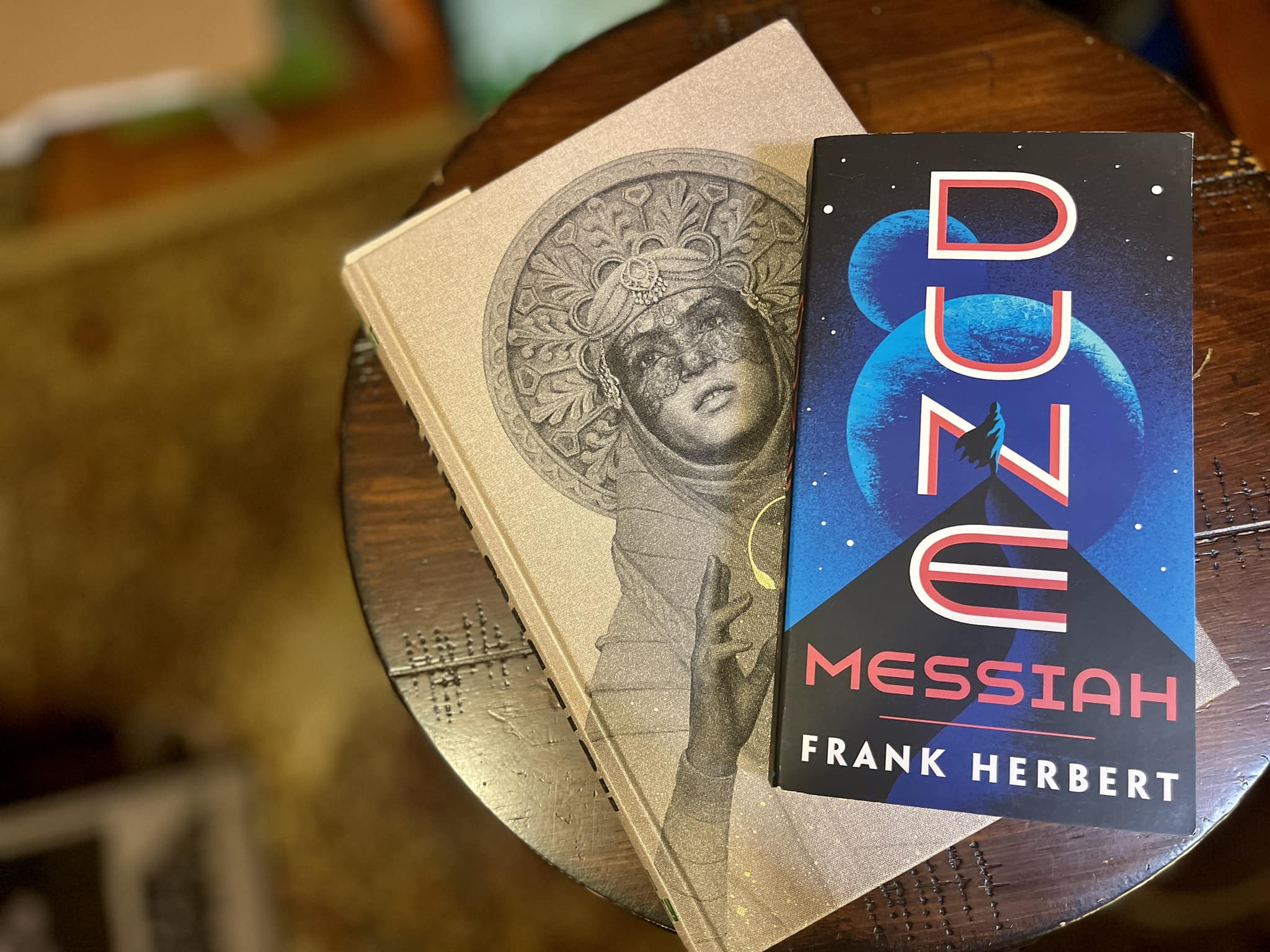While I've had Dune on my mind, I went and picked up Frank Herbert's Dune: Messiah and read and listened through it. I think I read it when I was in high school or college, but I didn't remember anything other than glimpses. (I did see the SCI FI channel series though). It was an interesting followup, and a very different read from that of the first installment. I'll have to pick up Children of Dune next. This time around read this in three places: the audiobook edition while driving two and from work, the mass market paperback while out and about, and the Folio Society edition at home. It was a fun experience.
