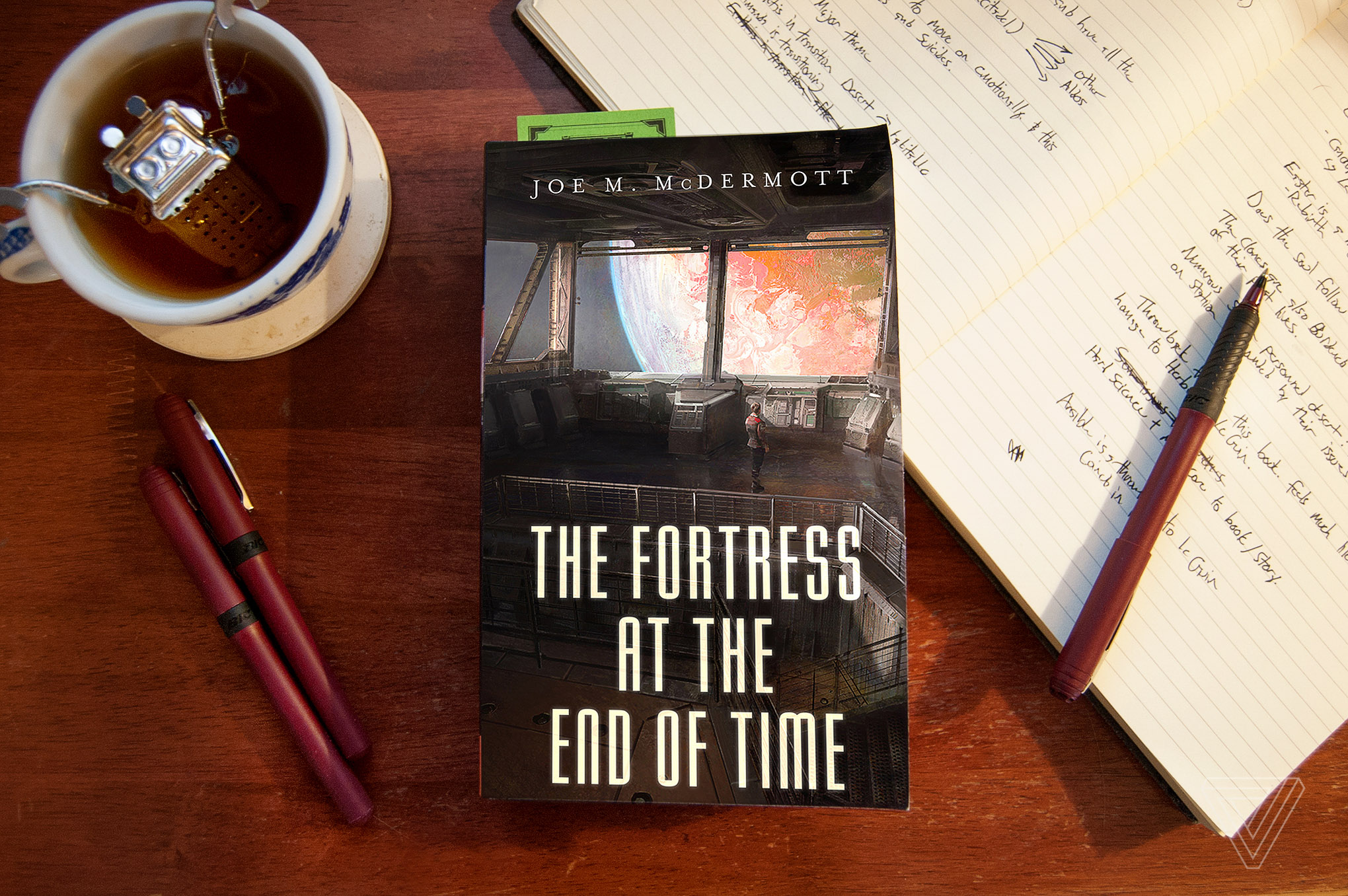One of the big things that I ended up doing this year was photography for my book reviews. I spoke with James about what the look should be, and we came up with a pretty standard formula for reviews: the book, surrounded by a notebook, pen, tea, and other small items that were thematically congruent to the story. This review for The Fortress at the End of Time was the first of these photographs.