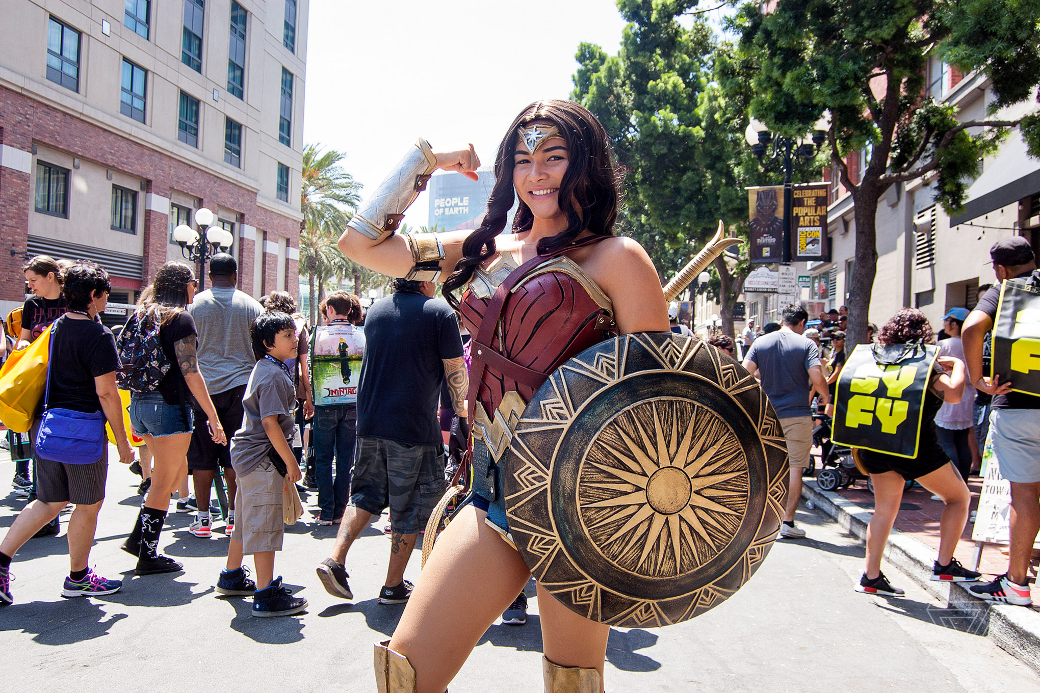 On the last day of San Diego Comic-Con, I started looking for Wonder Woman costumers, to chat with them about the popularity and appeal of the costumes. I photographed a couple, but Vanessa Perez of Florida stood out. She absolutely looked the part, and did a fantastic job assembling her costume.