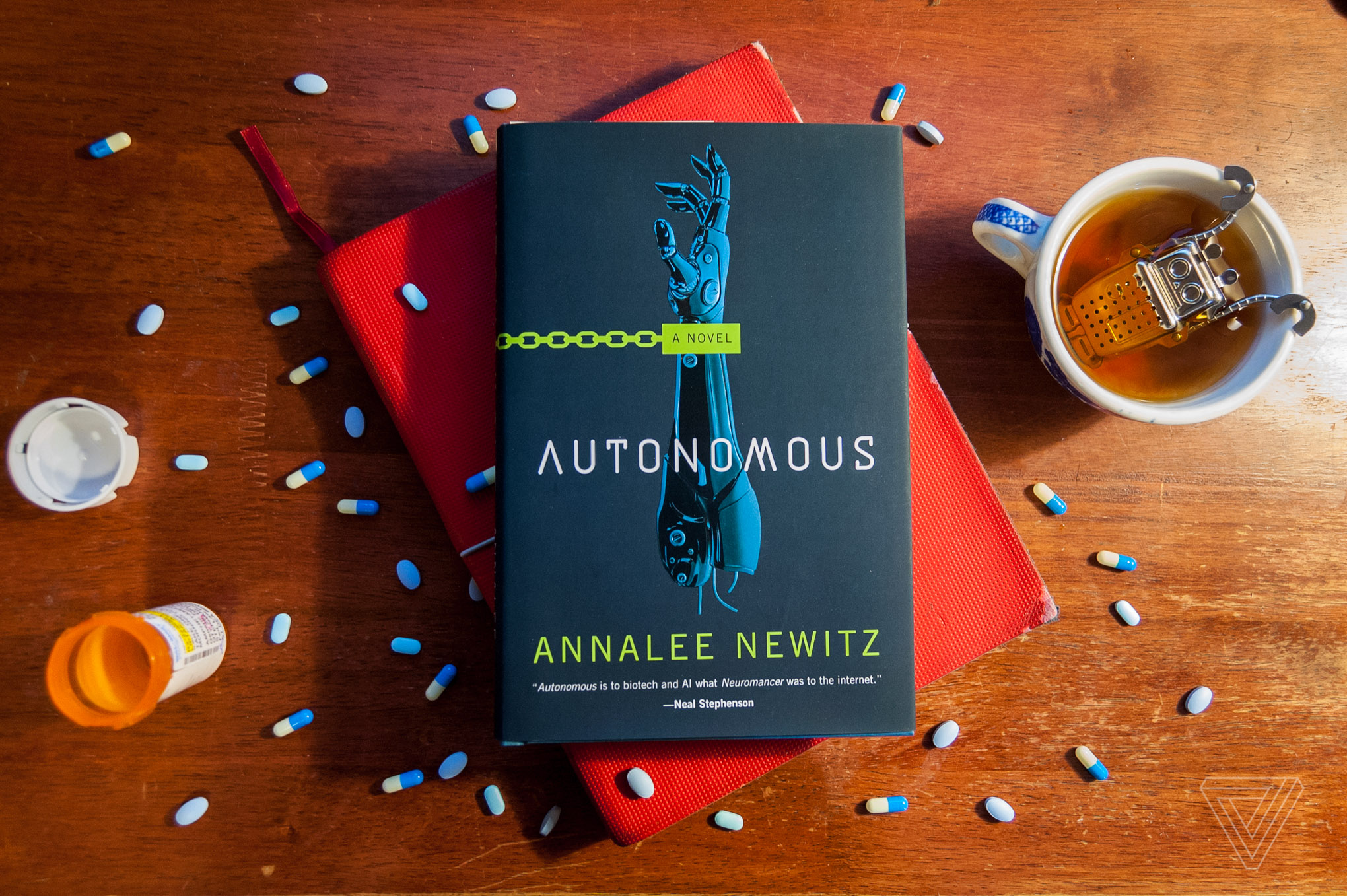 I didn't write the review for Annalee Newitz's debut novel Autonomous for The Verge (my review is here) but I did shoot the cover image. The book is all about pharmaceuticals in the future, so it seemed appropriate to scatter some random pills around in addition to the teacup and notebook.