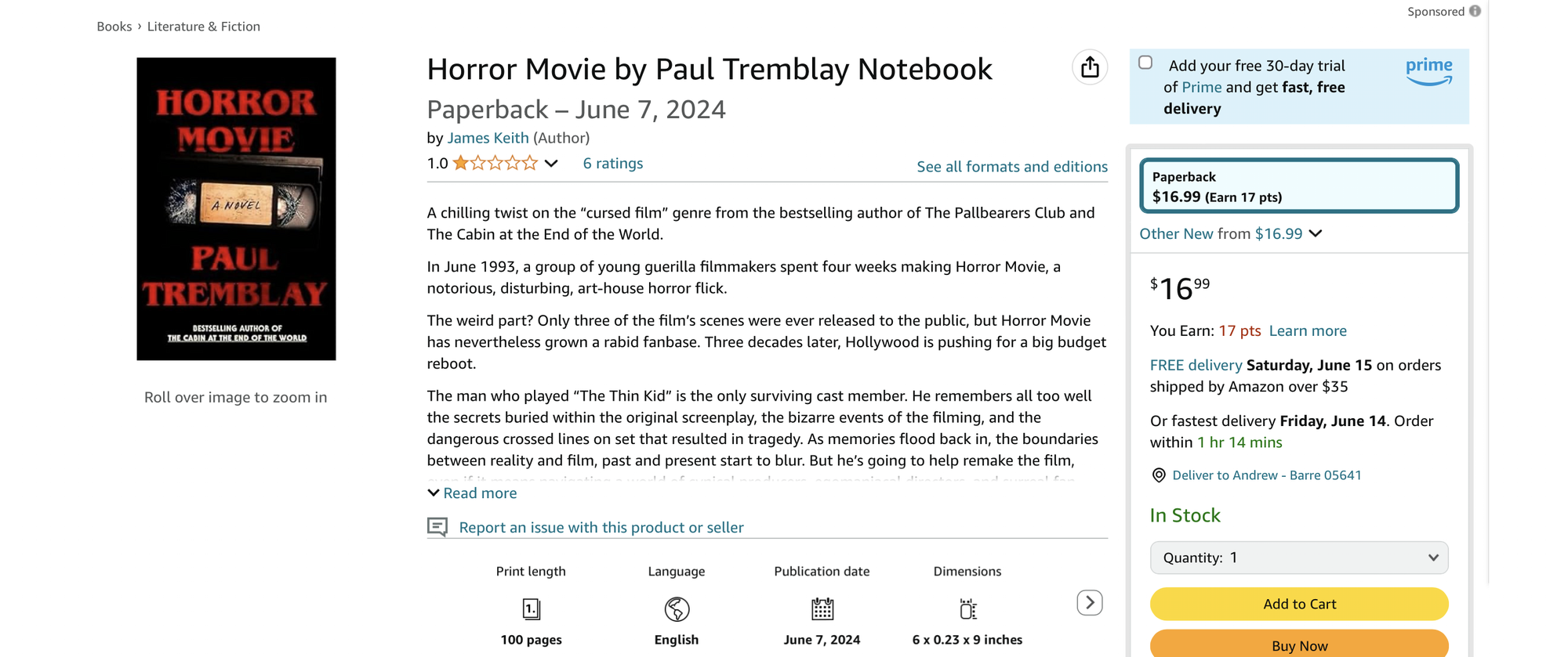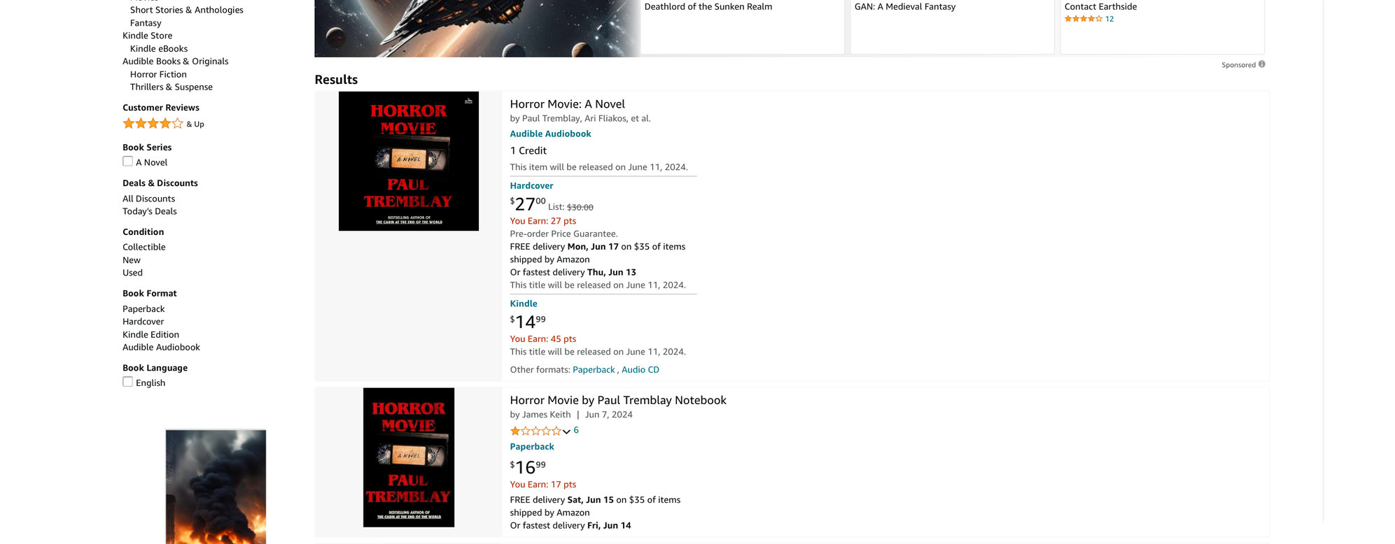 The eve of a book launch is a day where you don't want to encounter any unwanted surprises. That's what happened to Paul Tremblay this week: his latest novel Horror Movie hits stores, but if you went to Amazon and searched for it, you might have found an additional listing for it. This book had the right title, cover art, release date, and description, but the title was a little wonky, it was in the wrong format, and it says it was authored by a James Keith.