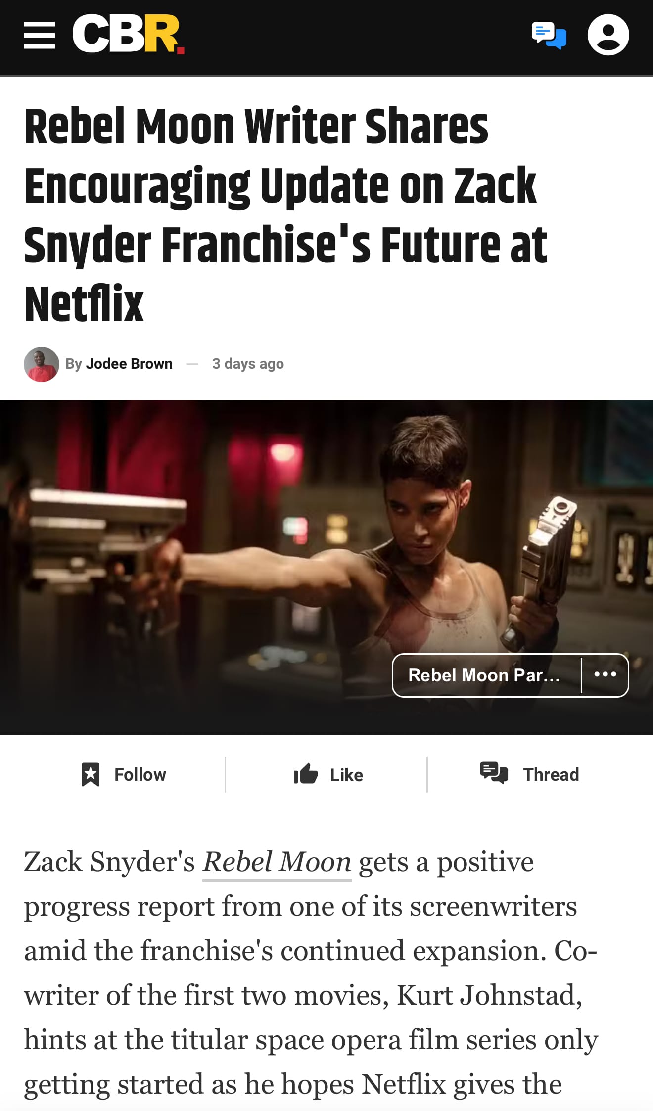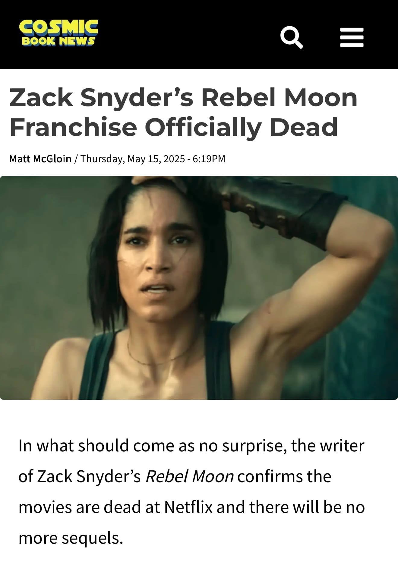 And finally, Cosmic Book News went with "the writer of Zack Snyder’s Rebel Moon confirms the movies are dead at Netflix and there will be no more sequels."