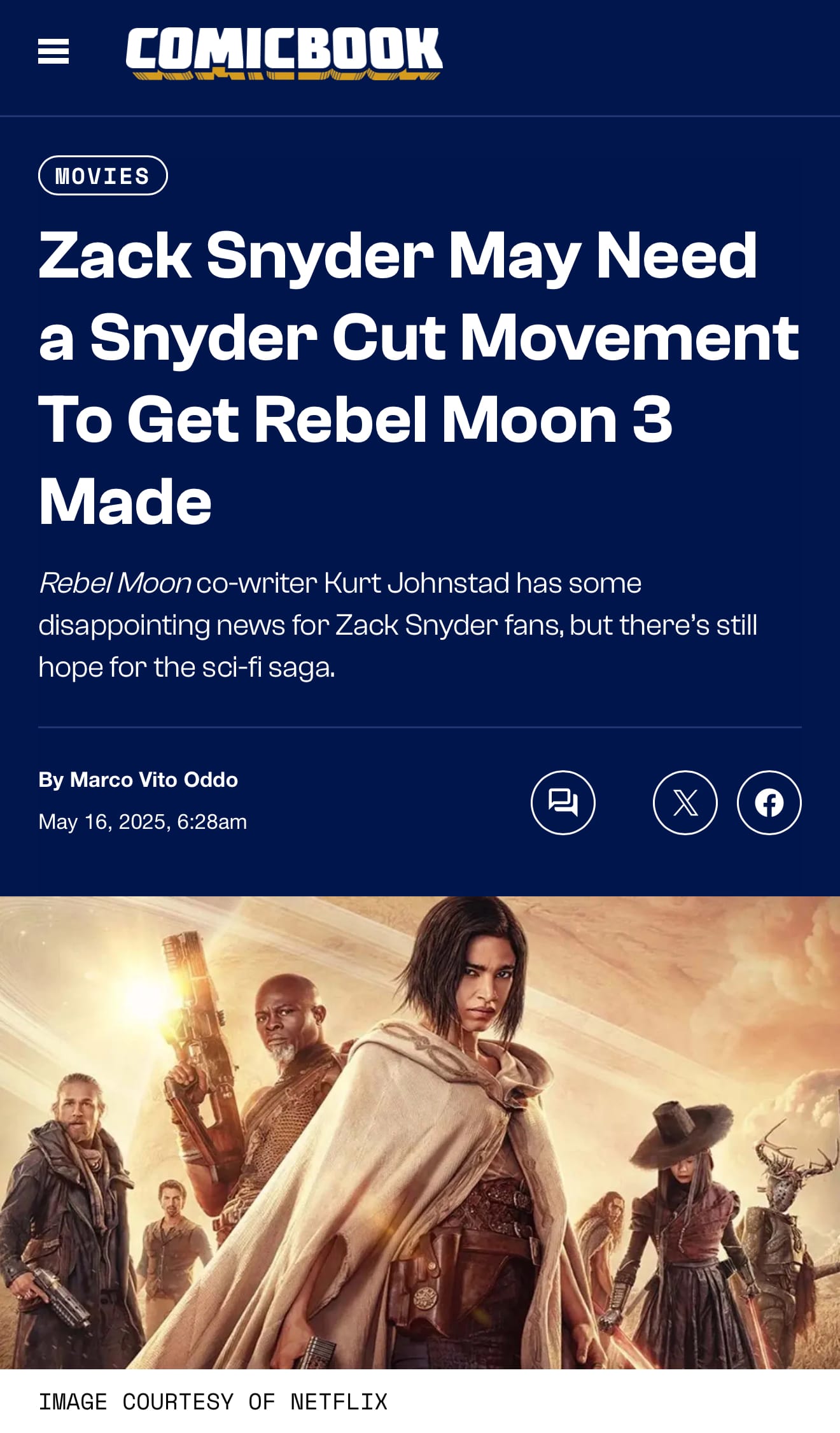 ComicBook.com's take is a little grimmer, and offers up a possible suggestion: "For a franchise envisioned as a sprawling multi-part epic, these new statements strongly imply that, from a conventional studio perspective, Rebel Moon is dead in the water, and its only path forward might echo one of the most unexpected fan-driven revivals in recent memory: Zack Snyder’s Justice League." (The URL also includes the words film-franchise-dead.)