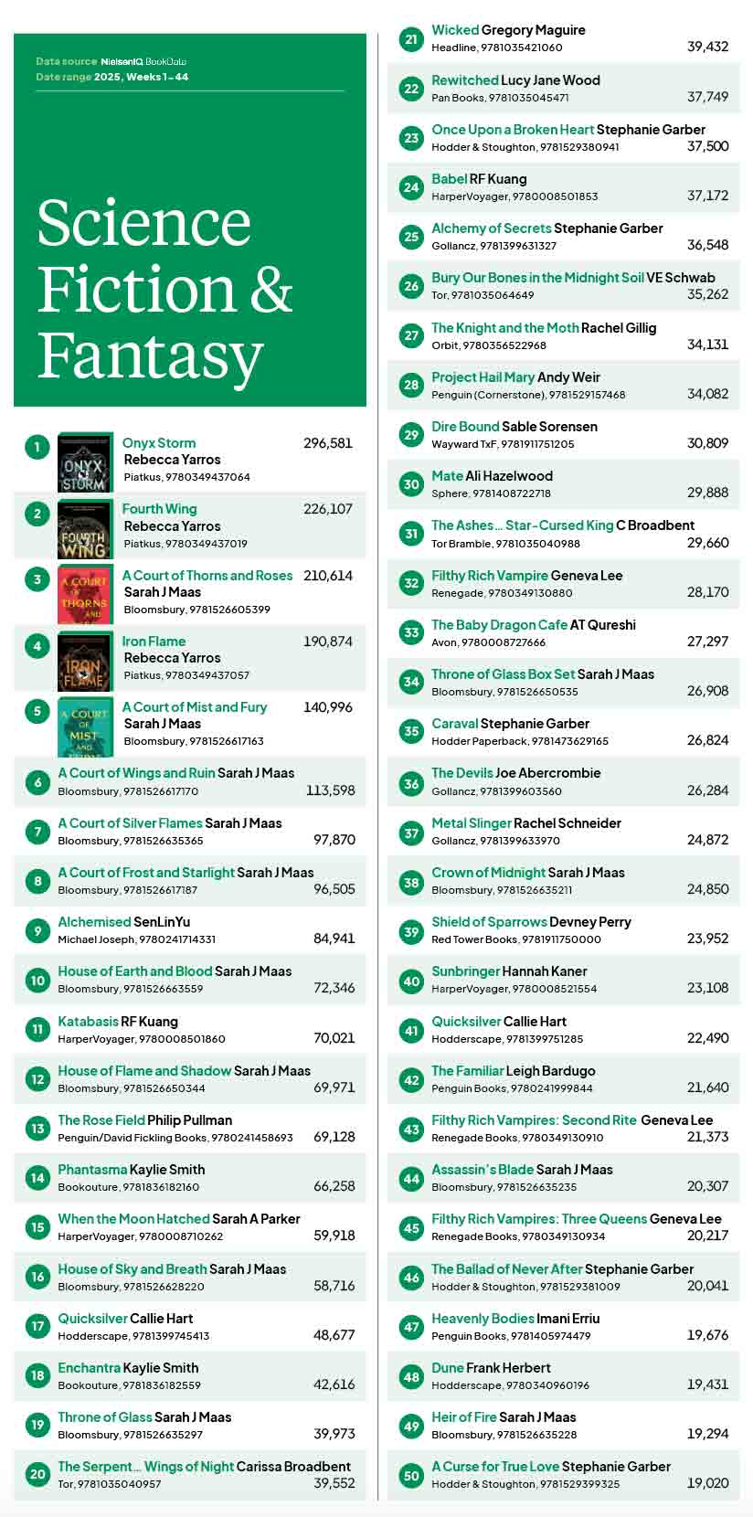 The article includes a chart that spells out the top 50 books by sales from 2025: Yarros, Maas, and SenLinYu, took up the top ten slots for the year, selling 11,361,216,834 copies between them.