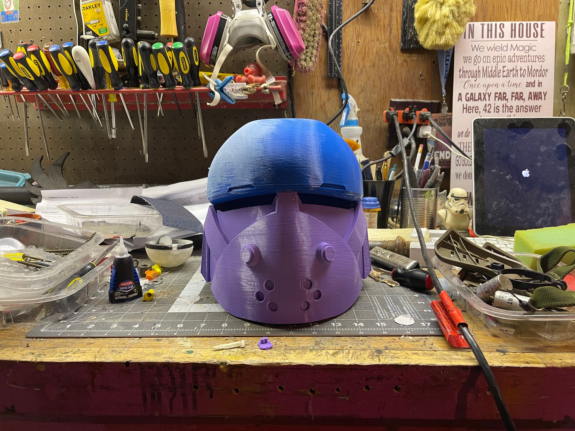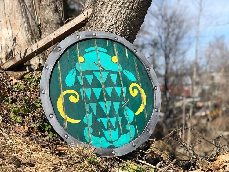 When the pandemic hit in March of 2020, I thought at the time: "well, maybe I'll be able to spend some more time working on some of the costumes that I've got piled up." I've got a spare set of shoretrooper armor that I've had sitting in a box, and a clone trooper that I still need to work on to get it to fit. I've since accumulated a set of Din Djarin's armor, with the ambitions of putting together a version of the character, and my son and I had made plans last fall to put together a Wrecker costume from The Bad Batch. (Somewhere in there, I put together a Din Djarin costume for Bram, so I guess I spent at least some time down there in the last two years.) In a fit of inspiration in that first week, I went and made a replica of the fisherman's shield from Breath of the Wild, which I was/am very happy with, and which now hands on the wall of my bathroom. (We have a sort of aquatic theme going on.)