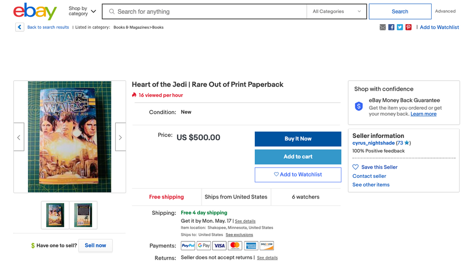 If you were looking on eBay for a Star Wars novel recently, you might have seen something odd: listings for a book that was "Rare Out of Print", "Extremely Limited Edition — Out of Print", and "No longer available." The editions in question are listed for exorbitant prices: bids in some active auctions going for around $80, while buy it now prices range anywhere for $300 to $1000. Already, a handful of people bought copies for hundreds of dollars.