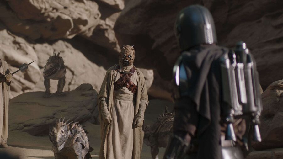 The Tuskens are shown in a light that we've never seen before: they explain that it's the humans stealing their water and killing their people, and these are issues that track closely with real-world grievances that Indigenous tribes have leveled against white colonists for generations. Later, we see them putting their long knowledge and relationship with the landscape to work: they put out a Bantha to placate the Krayt dragon, as Din explains that they've studied and observed the creature's lifecycle for generations.