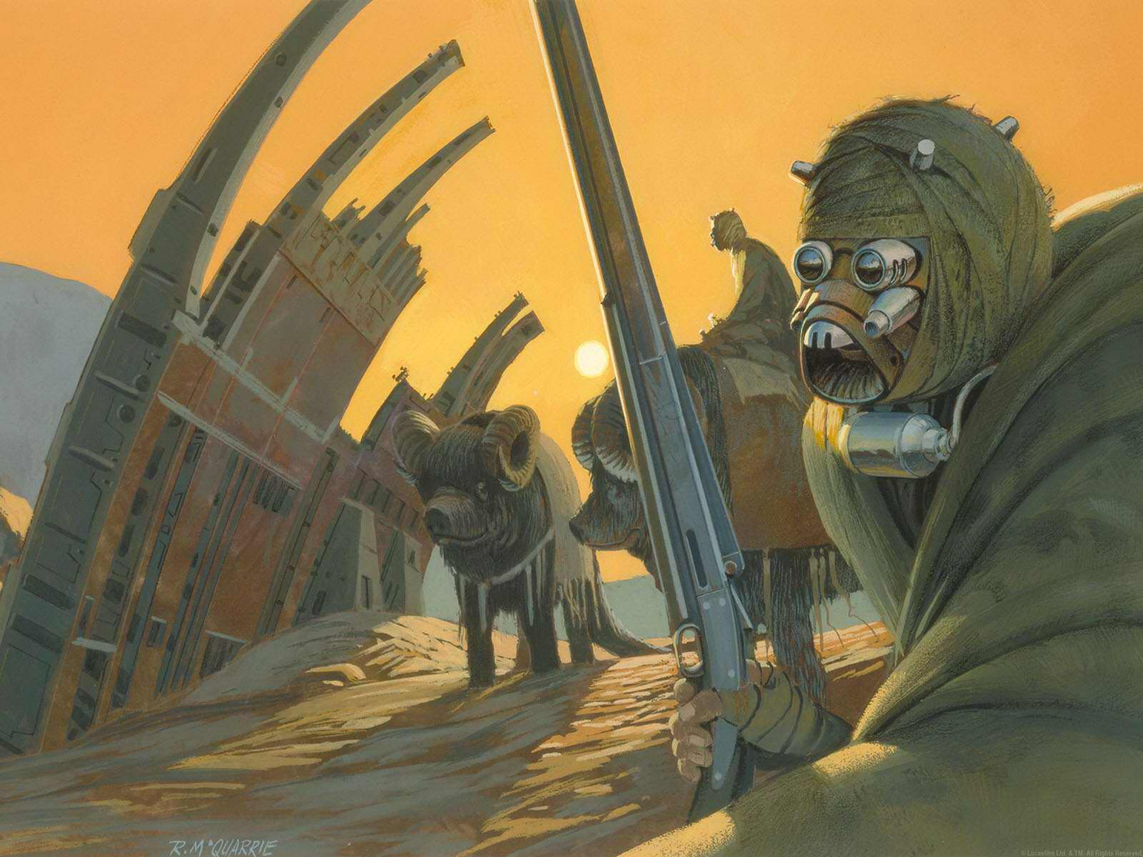The Tusken Raiders were based on native peoples. In Paul Duncan's expansive Star Wars Archives: Episodes IV-VI, 1977-1983, George Lucas notes that he "wanted the Tusken Raiders to be sort of like Bedouins, but at the same time very strange and mechanical," and his script described them in terms like "towering creature" and "sinister raiders" which "lets out a horrible shrieking laugh." Lucas tasked artist Ralph McQuarrie with designing the characters, and the artist later noted that their design didn't change much from his original sketches: