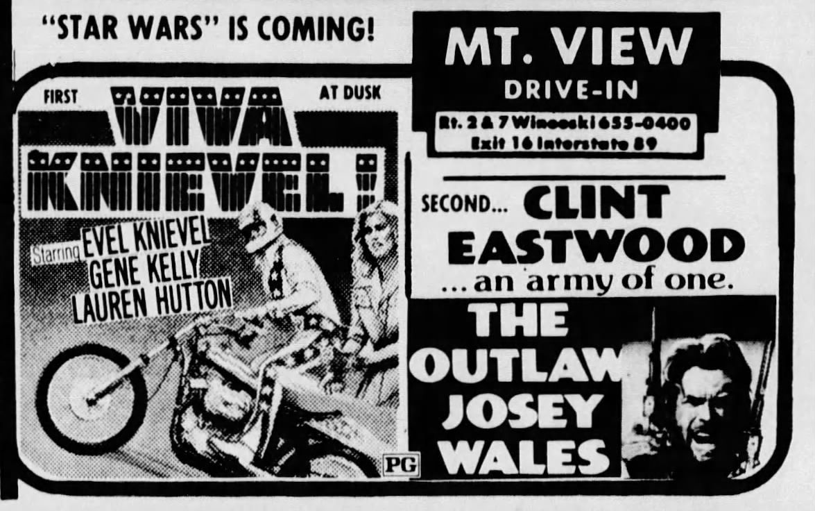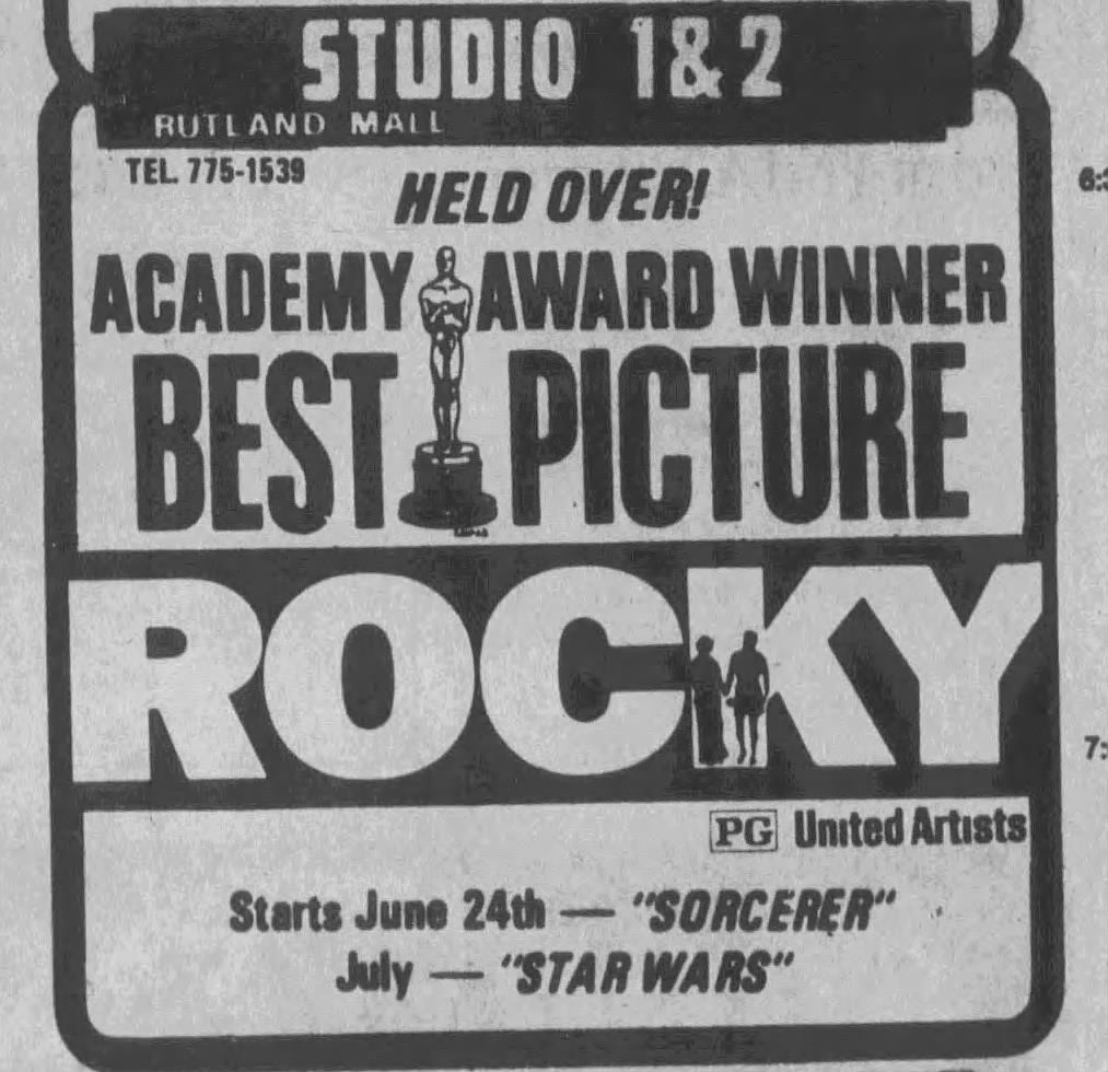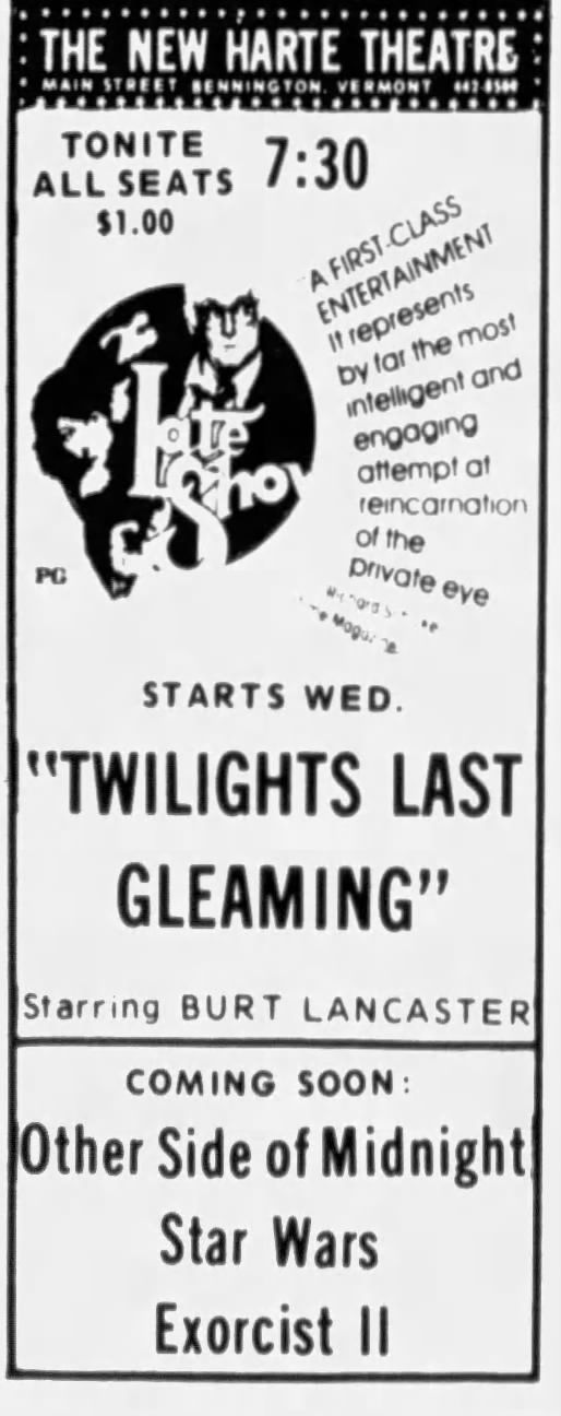 Back in the 1970s that wasn't the case: films opened and stayed in theaters for months, or in the case of Star Wars, opened months after that initial premiere. Case in point: the film didn't open in Vermont until July and August. I did some digging recently for some social media content for the Vermont Historical Society, and noted a handful of ads that theaters placed in newspapers in June that the film was on its way: