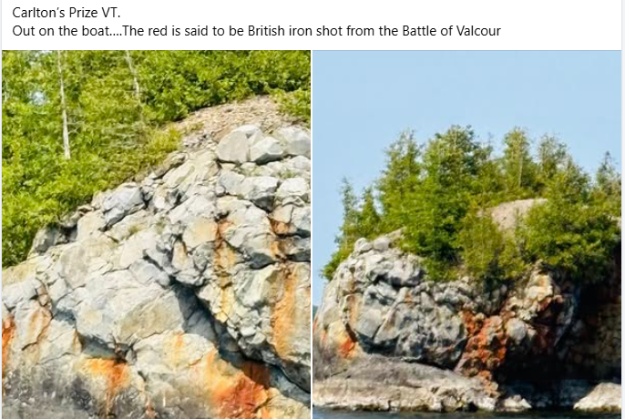 Carleton's Prize is a small rocky island that juts out of the lake just off of South Hero, and was reportedly bombarded by the British fleet who mistaking the rocks for one of the fleeing US ships. This is where the caption comes from: "the reddish stains are from the cannon balls that the British fired into it."