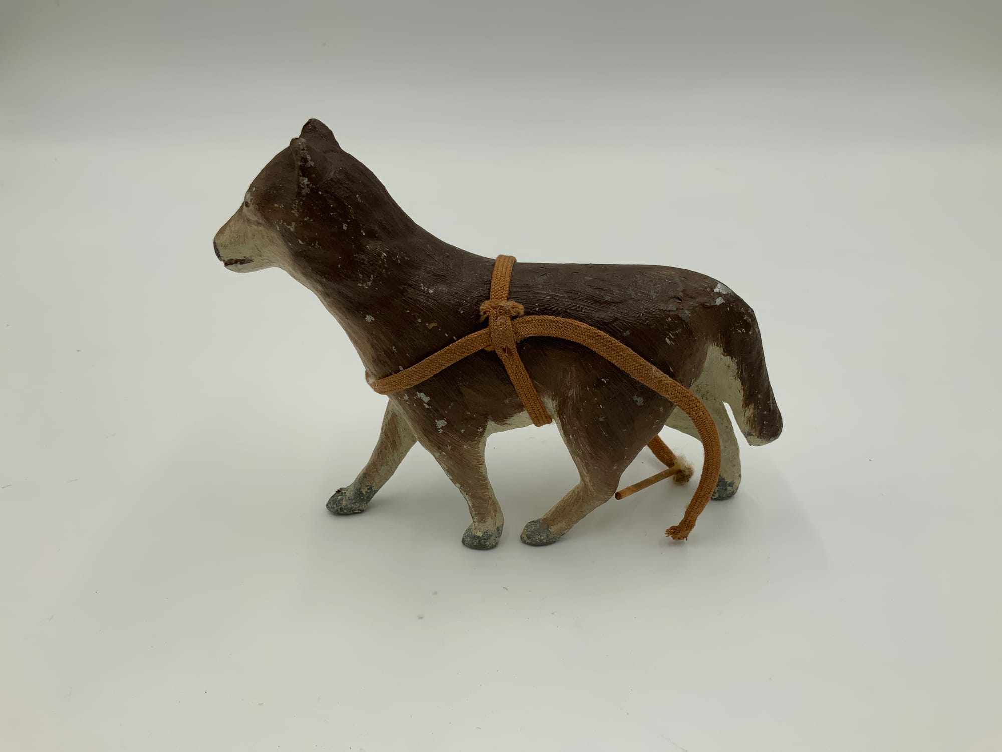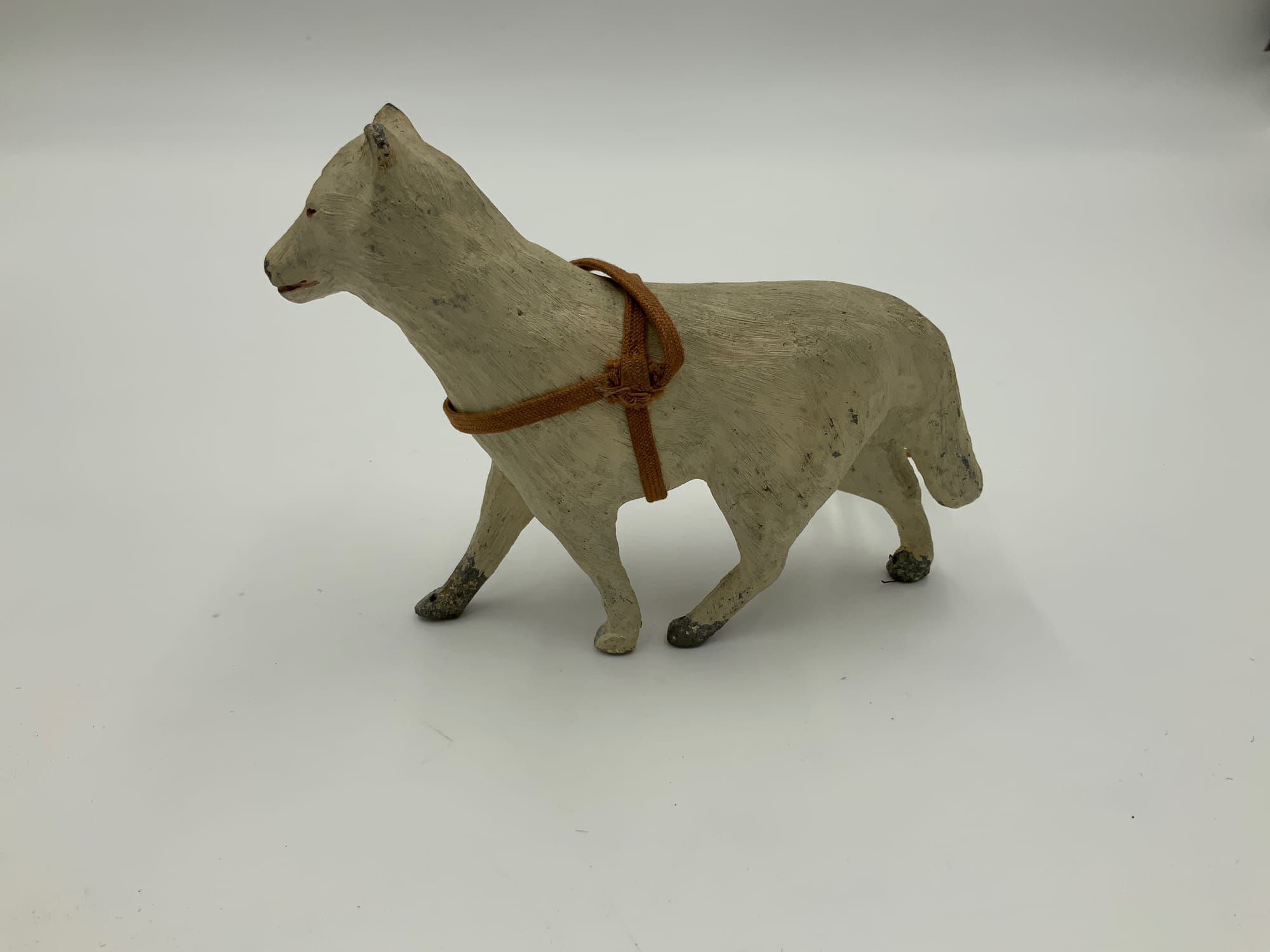 In the early 20th century, numerous polar expeditions utilized dogsled teams to move people and supplies across the ice. These objects are a depiction of a such a team that Byrd used on one of multiple Antarctic expeditions. The sled itself is made of a wooden base with side rails, and rope secures a rectangular package covered in orange fabric to show how supplies would have been transported while in Antarctica.