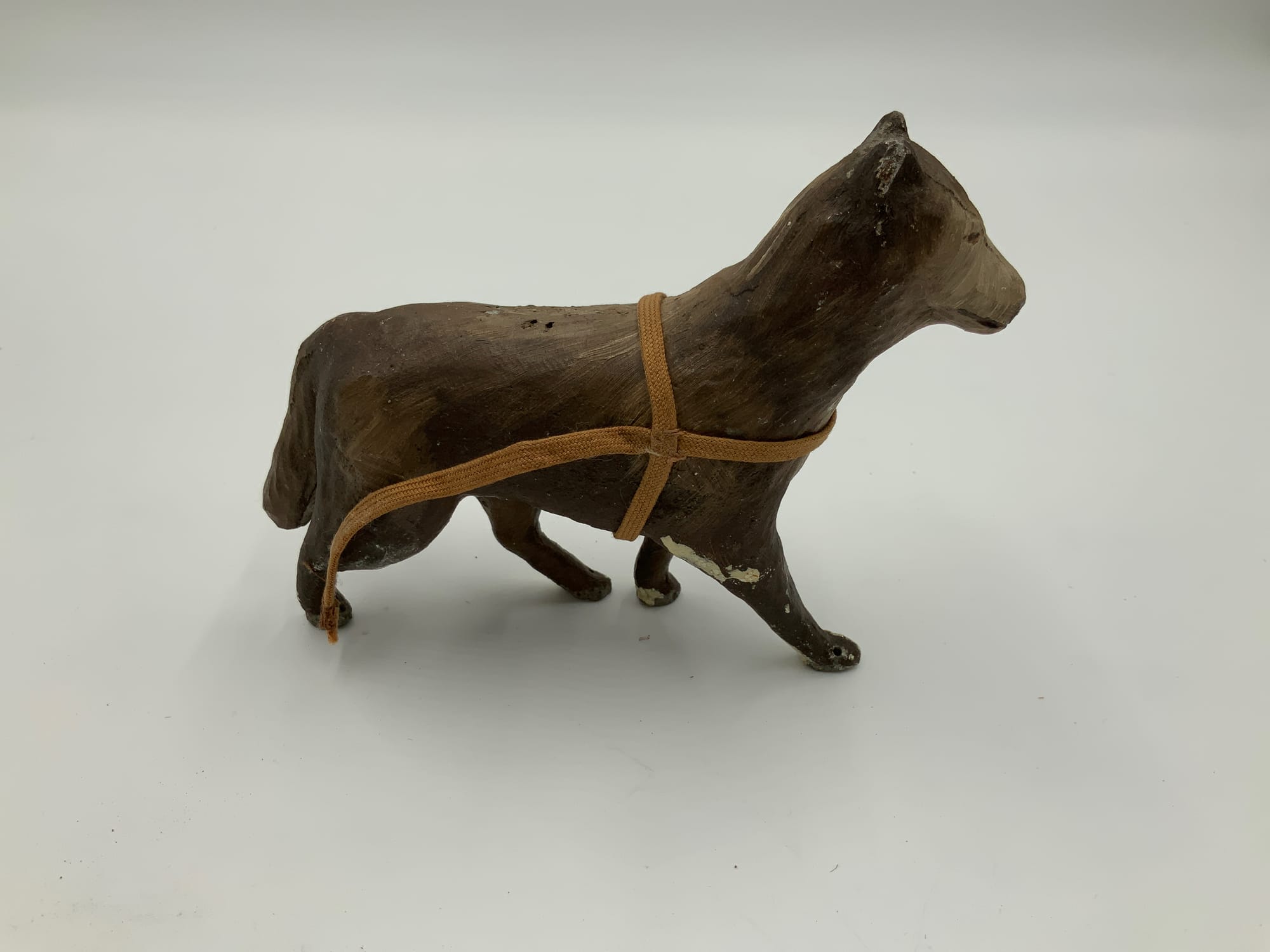 Each of the nine cast iron dogs is molded to appear in motion and is equipped with a cotton harness. Completing the set is a cast-iron figure of a man dressed in a brown parka, green pants, and black boots. The set is accompanied by a sign that reads “Scale Model of Admiral Byrd's Dog Team in the Antarctic, Designed in Vermont.”